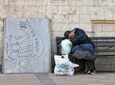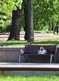 Moscow during self-isolation regime caused by the danger of the coronavirus COVID-19 spread. Introduction of the mandatory wearing of masks and gloves in public transport starting from May 12. Genre photo. Homeless woman sleeps on the bench.