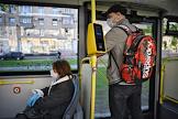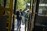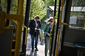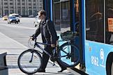 Moscow during self-isolation regime caused by the danger of the coronavirus COVID-19 spread. Introduction of the mandatory wearing of masks and gloves in public transport starting from May 12. Genre photo. Passenger with a bicycle gets off the bus on Bolshaya Yakimanka Street.