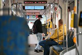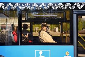 Moscow during self-isolation regime caused by the danger of the coronavirus COVID-19 spread. Introduction of the mandatory wearing of masks and gloves in public transport starting from May 12. Genre photo. Passengers wearing face masks and gloves sit in the bus.