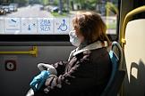 Moscow during self-isolation regime caused by the danger of the coronavirus COVID-19 spread. Introduction of the mandatory wearing of masks and gloves in public transport starting from May 12. Genre photo. Passenger wearing face mask sits in the bus.