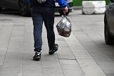 Moscow during self-isolation regime caused by the danger of the coronavirus COVID-19 spread. Introduction of the mandatory wearing of masks and gloves in public transport starting from May 12. Genre photo. Man carries a garbage bag.