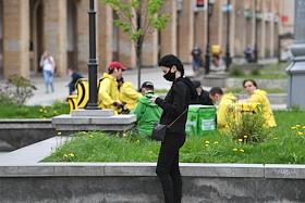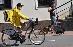 Moscow during self-isolation regime caused by the danger of the coronavirus COVID-19 spread. Genre photo. Passers-by wearing face masks. Yandex.Food Delivery Service courier and young woman walking two dogs.