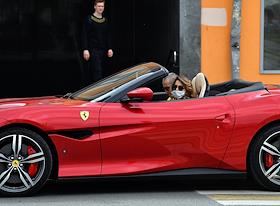 Moscow during self-isolation regime caused by the danger of the coronavirus COVID-19 spread. Introduction of the mandatory wearing of masks and gloves in public transport starting from May 12. Genre photo. Woman wearing face mask drives an open-top car.
