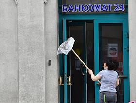 Moscow during self-isolation regime caused by the danger of the coronavirus COVID-19 spread. Introduction of the mandatory wearing of masks and gloves in public transport starting from May 12. Genre photo. Cleaner washes the doors of the bank branch.