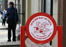 Moscow during self-isolation regime caused by the danger of the coronavirus COVID-19 spread. Genre photo. Sticker on the trash can stand reading: "Please do not drink in the courtyards and playgrounds" by Red and White alcoholic and non-alcoholic beverages store.