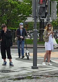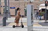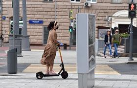 Moscow during self-isolation regime caused by the danger of the coronavirus COVID-19 spread. Introduction of the mandatory wearing of masks and gloves in public transport starting from May 12. Genre photo. Young woman wearing face mask and gloves rides electric scooter.