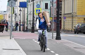 Moscow during self-isolation regime caused by the danger of the coronavirus COVID-19 spread. Introduction of the mandatory wearing of masks and gloves in public transport starting from May 12. Genre photo. Man wearing gloves rides bicycle while holding a bouquet of flowers.