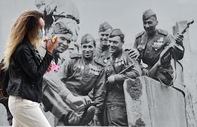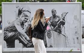 Moscow during self-isolation regime caused by the danger of the coronavirus COVID-19 spread. Introduction of the mandatory wearing of masks and gloves in public transport starting from May 12. Genre photo. Young woman wearing face mask talk on her smartphone while walking past Victory Day poster.