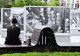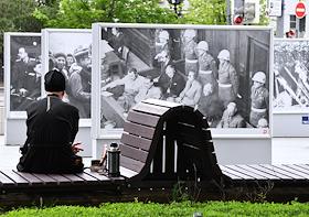 Moscow during self-isolation regime caused by the danger of the coronavirus COVID-19 spread. Introduction of the mandatory wearing of masks and gloves in public transport starting from May 12. Genre photo. Priest having a snack on a bench on the boulevard by the Victory Day street photo exhibition.
