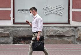 Moscow during self-isolation regime caused by the danger of the coronavirus COVID-19 spread. Introduction of the mandatory wearing of masks and gloves in public transport starting from May 12. Genre photo. Man wearing face mask walks past the storefront with an ad reading: "We are closing."