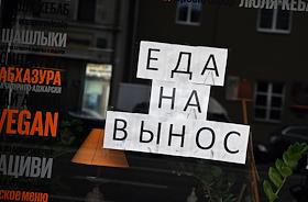 Moscow during self-isolation regime caused by the danger of the coronavirus COVID-19 spread. Genre photo. Notice saying "takeaway" in the restaurant window.