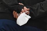 Moscow during self-isolation regime caused by the danger of the coronavirus COVID-19 spread. Introduction of the mandatory wearing of masks and gloves in public transport starting from May 12. Genre photo. Face mask in man's hands.