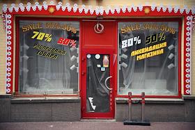 Moscow during self-isolation regime caused by the danger of the coronavirus COVID-19 spread. Genre photo. Discounts, sales and liquidation ads of the store.