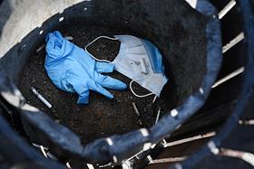 Moscow during self-isolation regime caused by the danger of the coronavirus COVID-19 spread. Genre photo. Gloves, cigarette butts and face mask in the trash can.