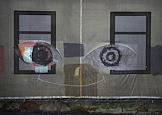 Moscow during self-isolation regime caused by the danger of the coronavirus COVID-19 spread. Genre photo. Construction cover cloth with cut-outs that look like a mask.