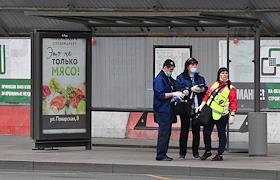 Moscow during self-isolation regime caused by the danger of the coronavirus COVID-19 spread. Introduction of the mandatory wearing of masks and gloves in public transport starting from May 12. Genre photo. Ticket inspectors wearing face masks stand on the bus stop.