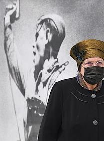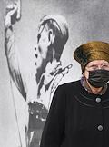 Moscow during self-isolation regime caused by the danger of the coronavirus COVID-19 spread. Introduction of the mandatory wearing of masks and gloves in public transport starting from May 12. Genre photo. Elderly woman weaning black face mask is seen with the Victory Day poster in the background.