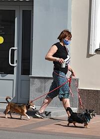 Moscow during self-isolation regime caused by the danger of the coronavirus COVID-19 spread. Genre photo. Young woman wearing face mask walks two dogs on the street.