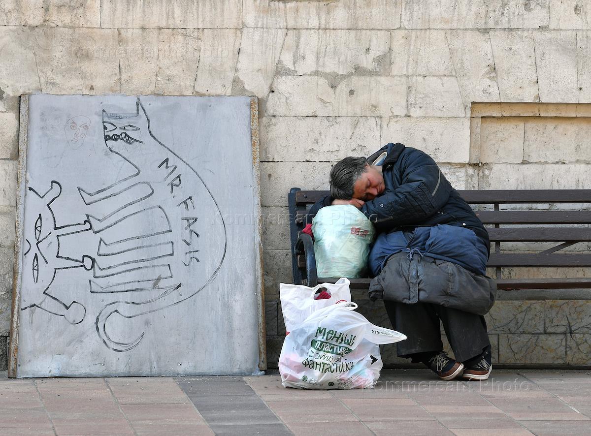 Москва во время режима самоизоляции из-за опасности распространения коронавирусной инфекции COVID-19. Введение с 12 мая режима обязательного ношения масок и перчаток в общественном транспорте. Жанровая фотография. Женщина-бомж спит на скамейке.