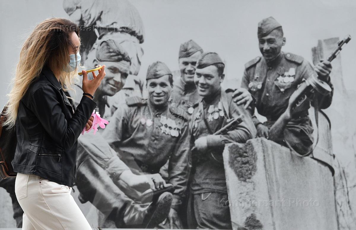 Москва во время режима самоизоляции из-за опасности распространения коронавирусной инфекции COVID-19. Введение с 12 мая режима обязательного ношения масок и перчаток в общественном транспорте. Жанровая фотография. Девушка в медицинской маске с мобильным телефоном на фоне плаката ко Дню Победы.