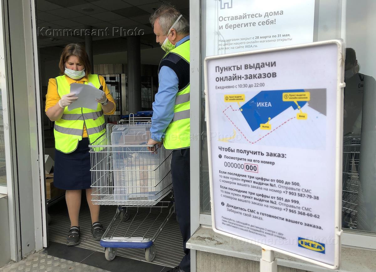 Москва во время режима самоизоляции из-за опасности распространения коронавирусной инфекции COVID-19. Введение с 12 мая режима обязательного ношения масок и перчаток в общественных местах. Жанровая фотография. Сотрудники гипермаркета IKEA в медицинских масках у пункта выдачи онлайн-заказов.