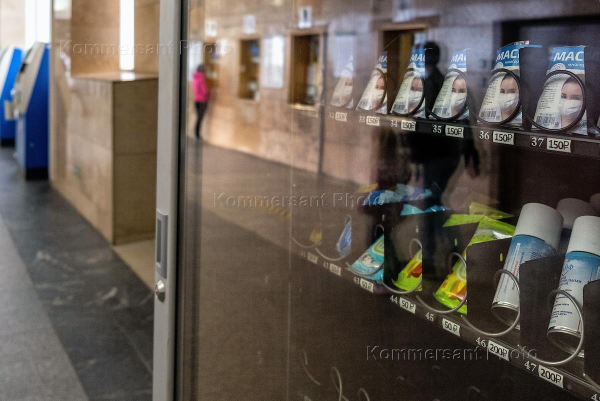 Санкт-Петербург во время режима самоизоляции из-за опасности распространения коронавирусной инфекции COVID-19. Жанровая фотография. Вендинговый автомат по продаже средств индивидуальной защиты на станции метро "Купчино".