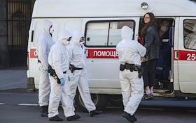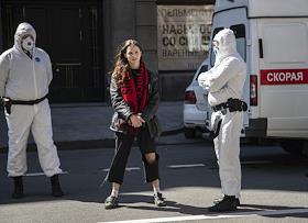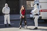 Санкт-Петербург во время режима самоизоляции из-за опасности распространения коронавирусной инфекции COVID-19. Сотрудники службы надзора за соблюдением режима в защитных костюмах и медицинских масках во время задержания жительницы Москвы, которая нарушила режим самоизоляции и приехала в Санкт- Петербург 08 мая 2020 года.