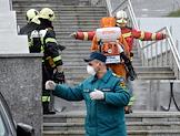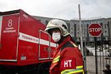 Санкт-Петербург во время режима самоизоляции из-за опасности распространения коронавирусной инфекции COVID-19. Последствия пожара в Городской больнице Святого Георгия. В пожаре погибли пять пациентов с диагнозом COVID-19, подключенных к аппарату ИВЛ в отделении реанимации. Сотрудники службы дезинфекции и МЧС России во время работы на территории больницы после пожара.
