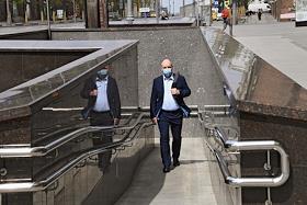 Москва во время режима самоизоляции из-за опасности распространения коронавирусной инфекции COVID-19. Введение с 12 мая режима обязательного ношения масок и перчаток в общественных местах. Жанровая фотография. Мужчина в медицинской маске выходит из подъемного пешеходного перехода.