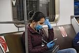 Москва во время режима самоизоляции из-за опасности распространения коронавирусной инфекции COVID-19. Введение с 12 мая режима обязательного ношения масок и перчаток в общественном транспорте. Жанровая фотография. Пассажиры в медицинских масках и перчатках в вагоне поезда Московского метрополитена.