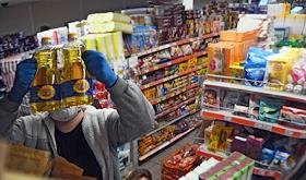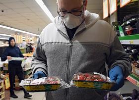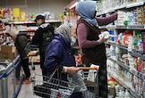 Москва во время режима самоизоляции из-за опасности распространения коронавирусной инфекции COVID-19. Жанровая фотография. В Москве и области вводится режим обязательного ношения масок и перчаток в общественных местах. Покупатели в магазине.