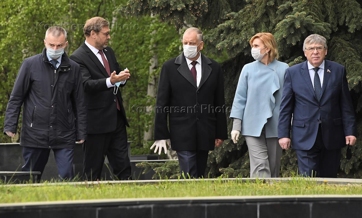 Москва во время режима самоизоляции из-за опасности распространения коронавирусной инфекции COVID-19. Церемония прощания с представителем в Совете Федерации (СФ) России от исполнительного органа государственной власти Рязанской области Олегом Ковалевым в Центральной клинической больнице (ЦКБ) Управления делами президента России. Представитель в СФ России от законодательной власти Курской области Валерий Рязанский (второй справа), председатель комитета СФ России по международным делам Константин Косачев (справа), представитель в СФ России от законодательного (представительного) органа государственной власти Ульяновской области Сергей Рябухин (в центре) и представитель в СФ России от законодательного (представительного) органа государственной власти Кировской области Вячеслав Тимченко (слева) во время церемонии.