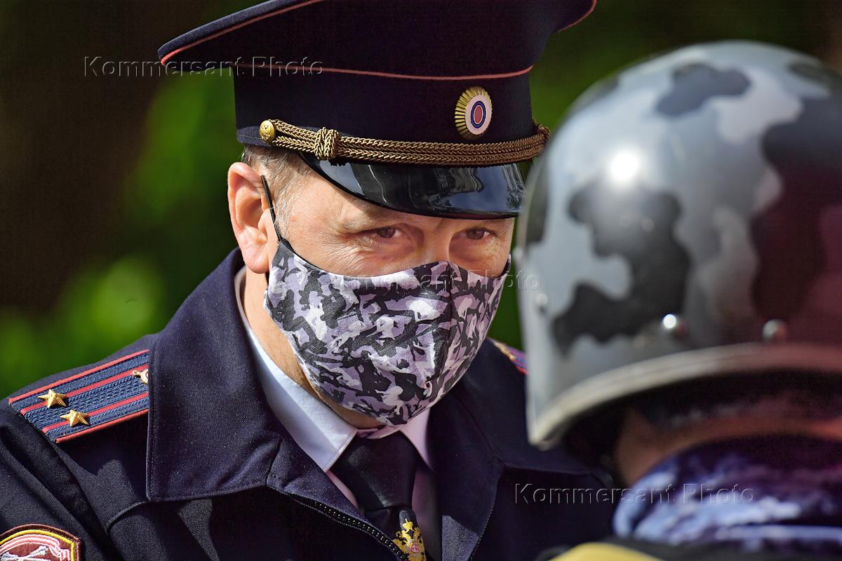 Москва во время режима самоизоляции из-за опасности распространения коронавирусной инфекции COVID-19. Сотрудник полиции во время оцепления места пожара в жилом доме на Фрунзенской набережной.