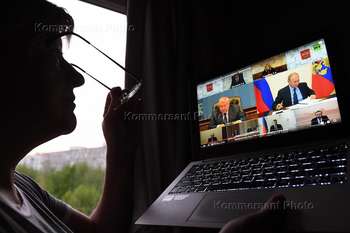 Режим самоизоляции из-за опасности распространения коронавирусной инфекции COVID-19. Жанровая фотография. Силуэт женщины на фоне окна, которая смотрит трансляцию совещения президента России Владимира Путина в режиме видеоконференции о развитии генетических технологий в России.