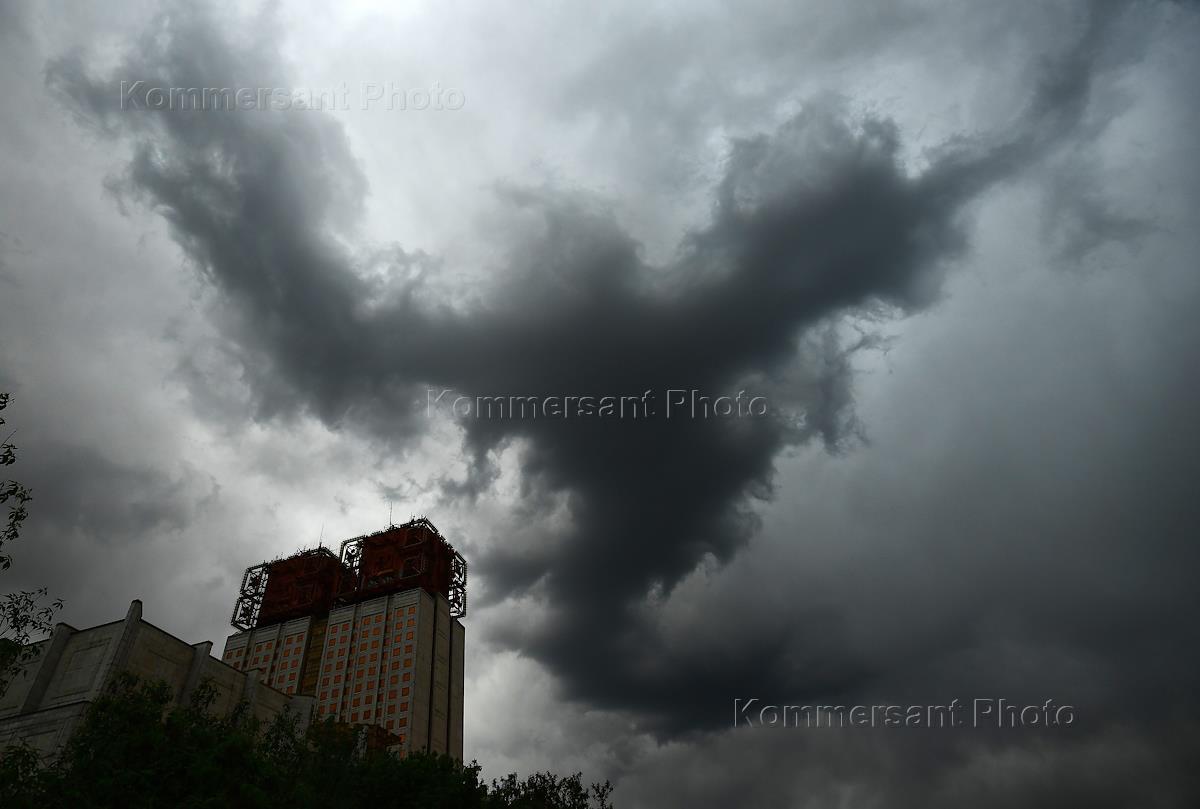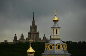 Жанровая фотография. Главное здание МГУ имени Ломоносова на Воробьевых горах и купол храма на фоне серого неба.