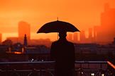 Жанровая фотография. Силуэт мужчины с зонтом на фоне закатного неба.