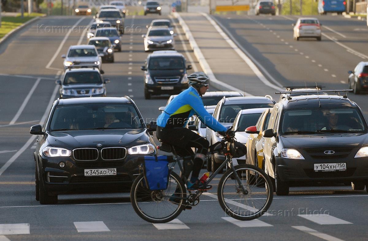 Moscow during self-isolation regime caused by the danger of the coronavirus COVID-19 spread. Genre photo. Cyclist at the crosswalk.