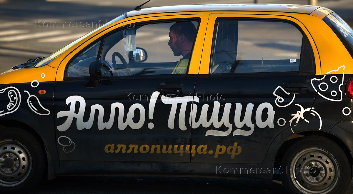 Москва во время режима самоизоляции из-за опасности распространения коронавирусной инфекции COVID-19. Жанровая фотография. Водитель-курьер за рулем автомобиля пиццерии "Алло, Пицца!".