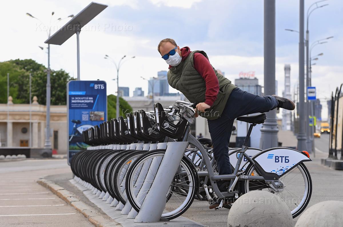 Москва во время режима самоизоляции из-за опасности распространения коронавирусной инфекции COVID-19. Жанровая фотография. Мужчина в медицинской маске на велосипеде в точке велопроката рядом с парком Горького.