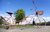 Москва во время режима самоизоляции из-за опасности распространения коронавирусной инфекции COVID-19. Жанровая фотография. Модель старинного велосипеда, вкопанная в землю, с вырубленной надписью на багажнике "телеканал Дождь" на Фрунзенской набережной.