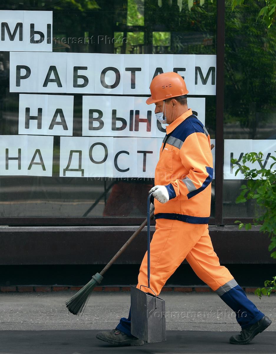 Москва во время режима самоизоляции из-за опасности распространения коронавирусной инфекции COVID-19. Жанровая фотография. Сотрудник коммунальной службы на фоне витрины ресторана с надписью "мы работаем на вынос, на доставку".
