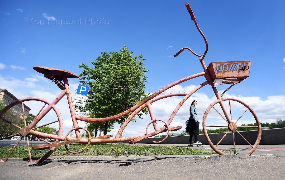 Москва во время режима самоизоляции из-за опасности распространения коронавирусной инфекции COVID-19. Жанровая фотография. Модель старинного велосипеда, вкопанная в землю, с вырубленной надписью на багажнике "телеканал Дождь" на Фрунзенской набережной.