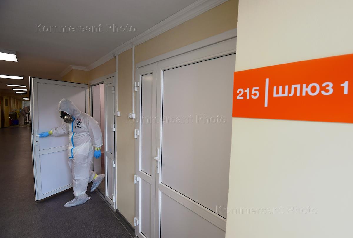 Московская область во время режима самоизоляции из-за опасности распространения коронавирусной инфекции COVID-19. Больница для приема пациентов с COVID-19. Медицинские работники в защитных костюмах во время лечения больного.