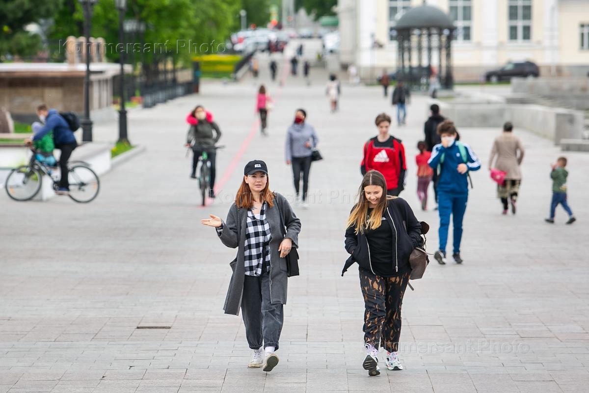 Екатеринбург во время режима самоизоляции из-за опасности распространения коронавирусной инфекции COVID-19. Жанровая фотография. Прохожие на улице.