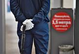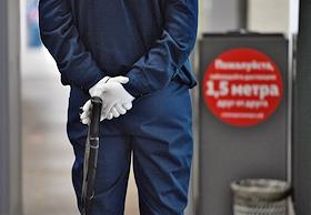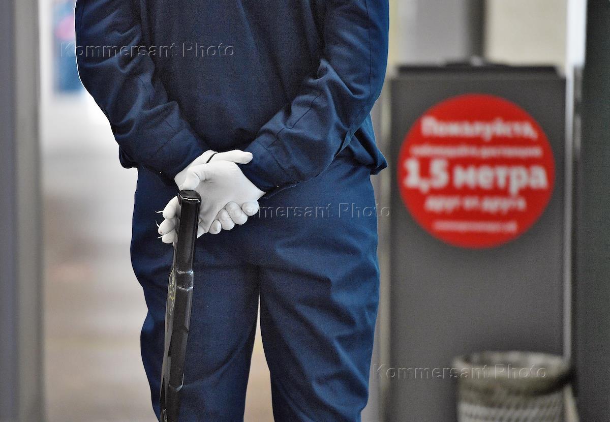 Москва во время режима самоизоляции из-за опасности распространения коронавирусной инфекции COVID-19. Жанровая фотография. Сотрудник охраны Ленинградского вокзала.