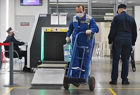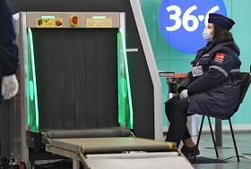 Москва во время режима самоизоляции из-за опасности распространения коронавирусной инфекции COVID-19. Жанровая фотография. Сотрудница службы безопасности в медицинской маске у рентгеновской установки на Ленинградском вокзале.