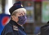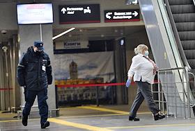 Москва во время режима самоизоляции из-за опасности распространения коронавирусной инфекции COVID-19. Жанровая фотография. Сотрудница охраны в медицинской маске на Ленинградском вокзале.
