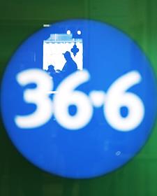 Москва во время режима самоизоляции из-за опасности распространения коронавирусной инфекции COVID-19. Жанровая фотография. Знак аптеки "36,6" на Ленинградском вокзале.
