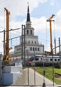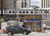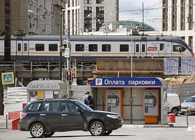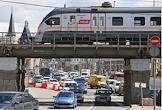 Москва во время режима самоизоляции из-за опасности распространения коронавирусной инфекции COVID-19. Жанровая фотография. Поезд "Ласточка" Московского центрального диаметра (МЦД) на Каланчевском путепроводе.