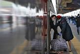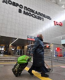 Москва во время режима самоизоляции из-за опасности распространения коронавирусной инфекции COVID-19. Жанровая фотография. Пассажиры с вещами на Ленинградском вокзале.